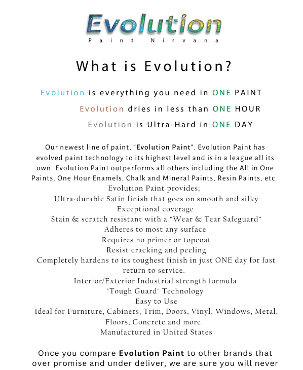 The makers of Evolution Paint have the skill and talent that has produced very unique, easy to use products to endure the test of time and strong enough to paint the toughest surfaces.