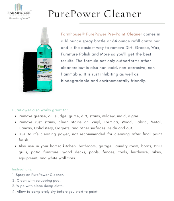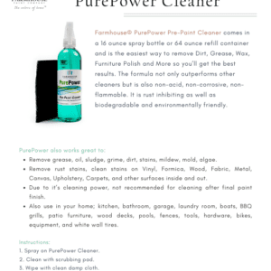 PurePower Pre-Paint Cleaner comes in a 16 ounce spray bottle and is the easiest way to remove Dirt, Grease, Wax, Furniture Polish and More so you’ll get the best results on your next painting project. The formula not only outperforms other cleaners but is also non-acid, non-corrosive, non-flammable. It is rust inhibiting as well as biodegradable and environmentally friendly.